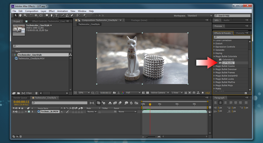 При работе с профилем Technicolor CineStyle необходимо проводить цветокоррекцию видео, чтобы вернуть изображению былую «смотрибельность». Вы можете почитать мою статью о том, как сделать видео с DSLR еще лучше здесь. Но если Вас нет возможности отстраивать цвет изображения детально, вы можете применить таблицу соответствий (LUT), разработанную специально для Technicolor CineStyle, которая вернет былую красоту картинке в пару кликов. Для работы нам потребуется Magic Bullet LUT Buddy 1.0. Его можно скачать с официального сайта www.redgiant.com бесплатно. Установив плагин для версии Adobe CS5 (C:\Program Files\Adobe\Common\Plug-ins\CS5\MediaCore\Magic Bullet LUT Buddy) для Windows, необходимо вручную перенести плагин в CS6 (C:\Program Files\Adobe\Common\Plug-ins\CS6\MediaCore\Magic Bullet LUT Buddy). Запускаем Adobe After Effects или Premiere, кидаем на таймлайн эффект LUT Buddy из группы Magic Bullet. |